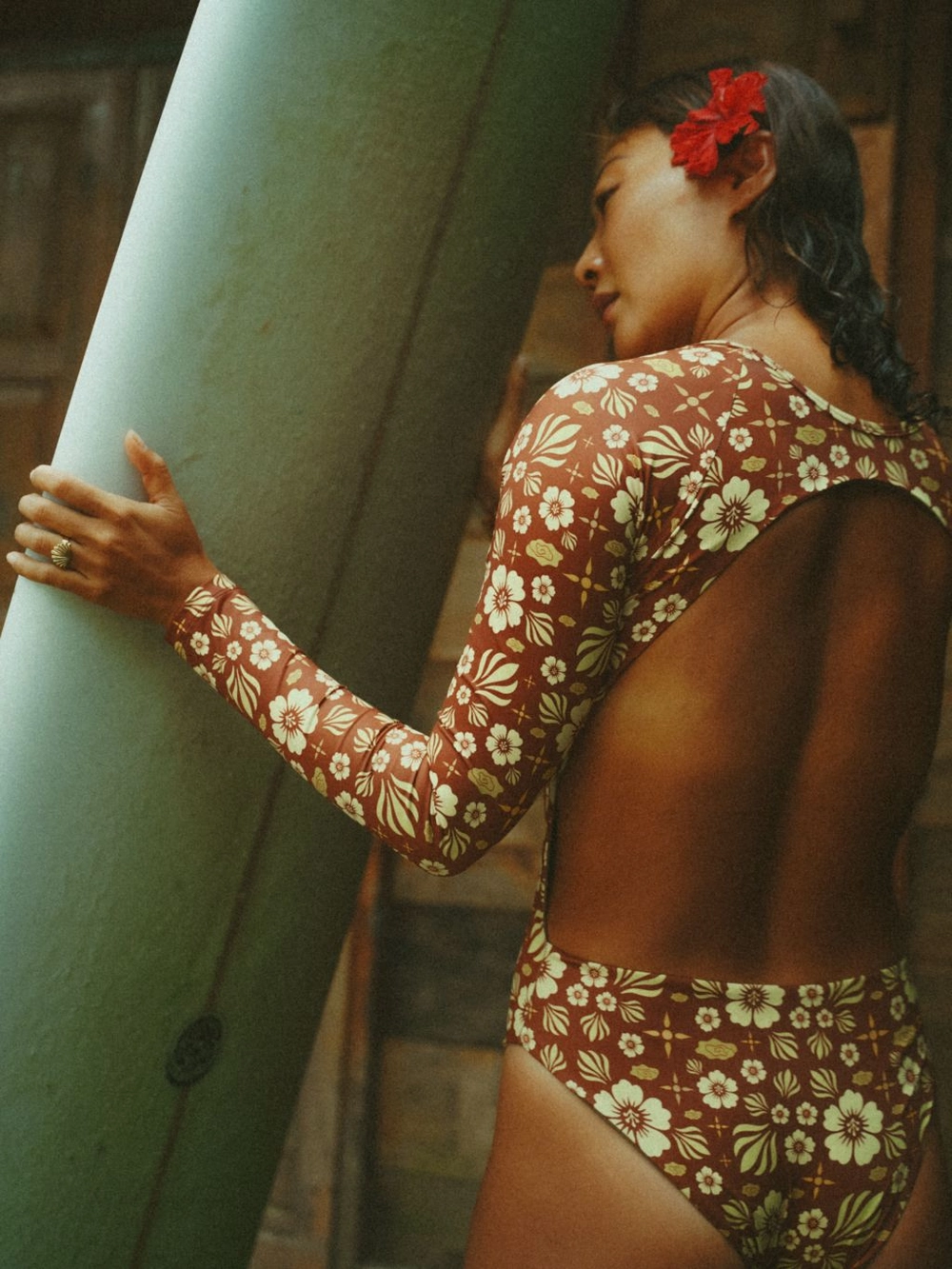 The long sleeves gently hug the body, providing a secure fit while surfing, while the open-back design allows for freedom of movement.